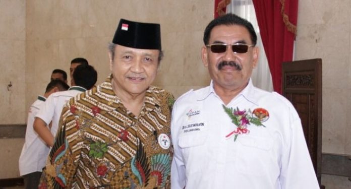 Ketua Umum Dewan Pimpinan Pusat Generasi Peduli Anto Narkoba (DPP GPAN) Brigjen Pol. (Purn) ADV Siswandi (Kemeja Puith) bersama Wakil Sekretaris Jenderal Organisasi BERSAMA selaku Dewan Redaksi BULIR.ID, Drs, Asri Hadi, MA