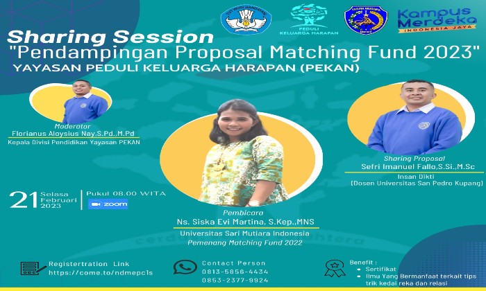 KUPANG, Bulir.id – Divisi pendidikan Yayasan Peduli Keluarga Harapan (PEKAN) menyelenggarakan kegiatan sharing sesion dengan mengusung tema Pendampingan Proposal Matching Fund 2023. Kegiatan tersebut menghadirikan beberapa pembicara dari beberapa kampus di Indonesia, yang diselenggarakan secara daring pada Selasa, (21/2/23).